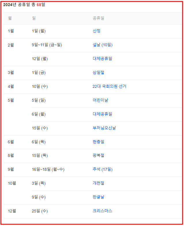 2024년 쉬는날 표로 한번에보기