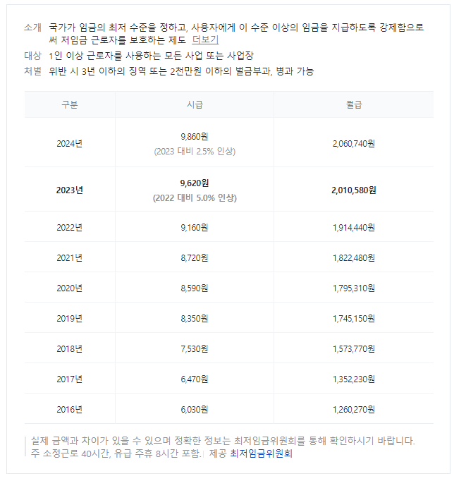 현재 2024년 최저임금은 9620원으로 곧 최저임금 만원대의 시대가 열릴예정입니다.