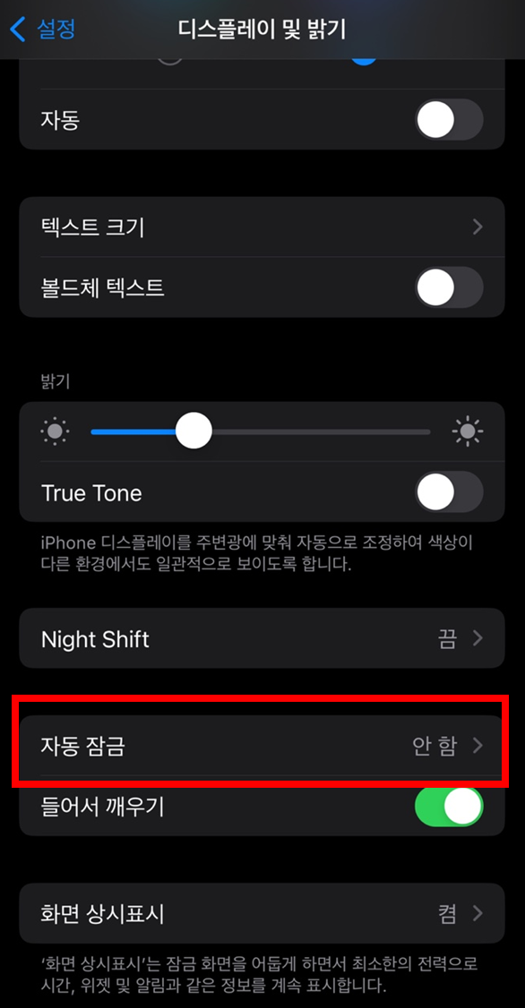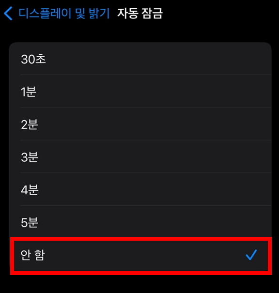 편한 사용을위해 안함으로 설정해놓고 사용하면 되지않냐 라고 생각 하시는분들이 있을텐데, 안함으로 할 경우 화면이 계속 켜져있는 상태가 되기때문에 배터리 소모 및 수명에 좋지않은 영향을 줄 수 있습니다. 참고바랄게요