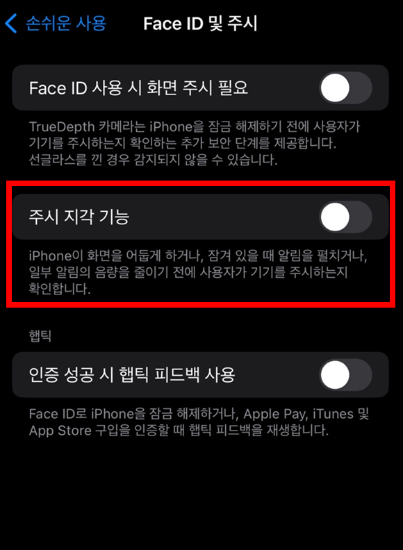 4. 주시 지각 기능을 OFF 로 바꿔주세요