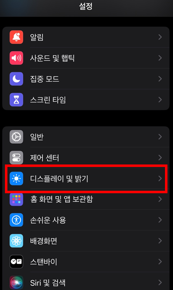 2. 아래로 조금 스크롤 하다보면 '디스플레이 및 밝기' 항목이 있습니다. 들어가주세요