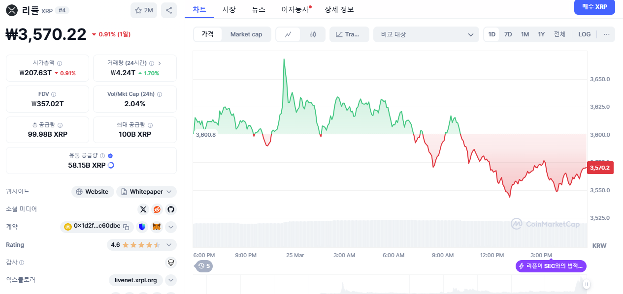 리플은 현재 약 3,600원대에서 거래 중이며, 최근 소송 종료 호재로 인해 가격 상승 모멘텀을 이어가고 있어요