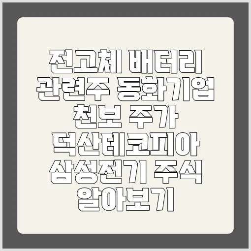 안녕하세요! 오늘은 전고체 배터리 관련주에 대해 아주 자세히 살펴보려고 해요. 최근 전기차와 에너지 저장장치의 발전으로 전고체 배터리가 주목받으며, 관련 주식도 큰 관심을 받고 있죠. 특히 국내 상장된 동화기업, 천보, 덕산테코피아, 그리고 글로벌 기업인 삼성전기까지 다양한 종목들이 있는데요, 이들 기업이 어떤 역할을 하고 있으며, 주가 흐름과 투자 포인트는 무엇인지 함께 알아보도록 할게요. 조금 복잡하게 느껴질 수도 있지만, 친근하게 설명드릴 테니 걱정 말고 따라오세요!